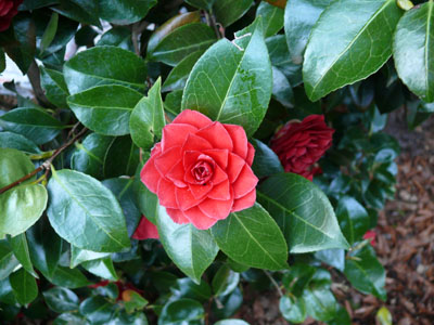 Camellia japonica 'Black Lace': für Sonne, 10-jährig: 2 m H., 1,5 m Br.