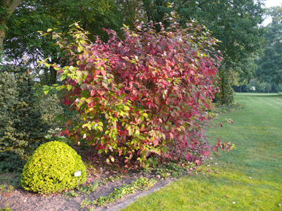 Cornus alba 'Sibirica': Sonne, Höhe und Breite: 300 cm, erträgt Staunässe, orangerote Herbstfärbung