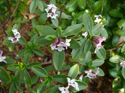 Daphne tangutica: Sonne bis Halbschatten, 10-jährig: ca. 80 cm, Blüte: stark duftend, April