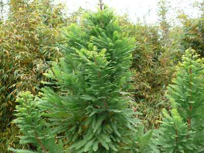 Taxodium distichum 'Peve Minaret': Sonne, 10-jährig: ca. 150 cm Höhe und ca. 50 cm Breite, rotbraune Herbstfärbung, erträgt Staunässe